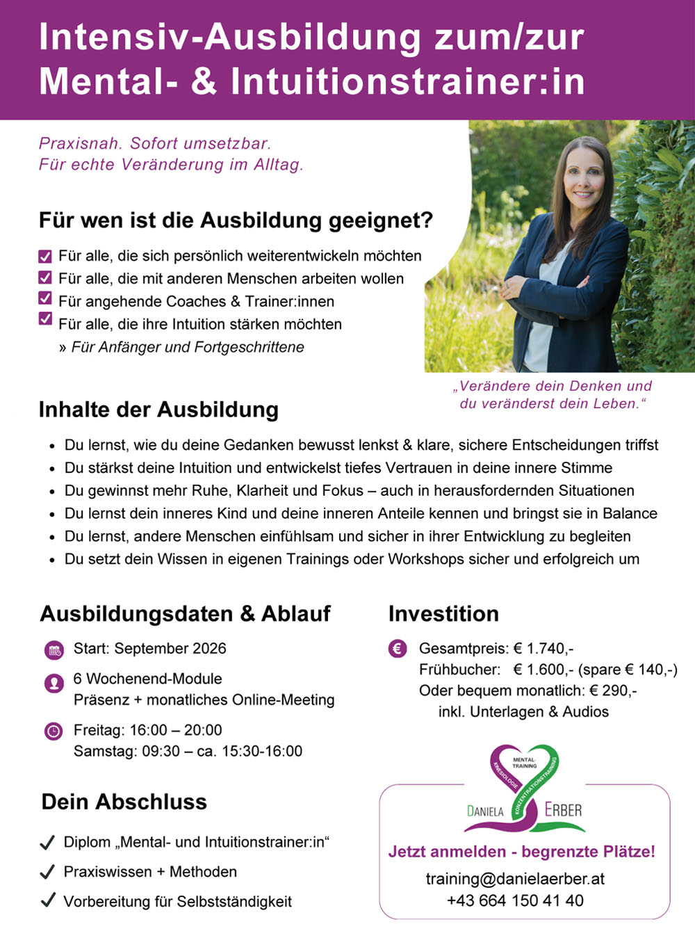 Intensiv Ausbildung Herzlich Willkommen bei der Akademie für Entwicklungs- und Bewusstseinsarbeit Intensiv-Ausbildung Mental- und Intuitionstrainer 2026/27 👉 Detailinfos und Termine 2026/27 👉 Flyer Kurzinfo Unsere Kursgruppe 2025/26 ☺️